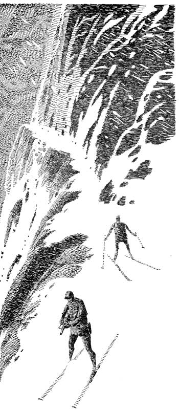 Troy and Alec pushed diagonally up the snow slope, pausing every few minutes to take new directional readings. The needles were now at right angles to them and reading well into the "hot" red division of the intensity meter. They still were ten feet below the crest and a cornice of snow hung out in a slight roof ahead of them. Both men had closed the face hatches of their insulated helmets and tiny circulators automatically went to work drawing off moisture and condensation from the treated plastic.
