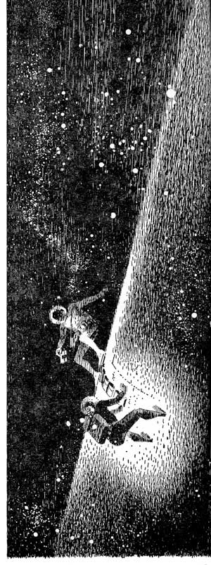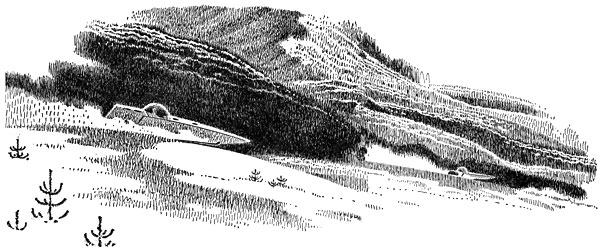 A few minutes later they broke out into the edge of the small clearing with its downed spruce and the two Sno cars. From the carriers they extracted light-weight collapsible plastic domed shelters. A half hour later the domes were joined together by a two-man shelter tube and their sleeping bags were spread in the rear dome. While Alec was shaking out the bags and stowing gear, Troy set up the tiny camp stove in the front dome, broke out the rations and began supper. The detachable, mercury-battery headlight from one of the Sno cars hung from the apogee of the front dome and the other car light was in the sleeping dome.
