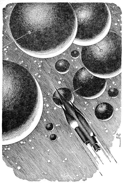 I had switched on four screens, each a different magnification. I pointed to a spheroid on one of the screens and said, "There's the trigger body. It's equipped with a sub-space energizer big enough to get it into sub-space and return it to normal. Then there is a small propulsor unit with just enough energy to send it to the center of that mess. Then it returns to normal space smack dab in the center of the core asteroid. And when the asteroid matter and the trigger body matter try to occupy the same space at the same time.... Watch it go out."