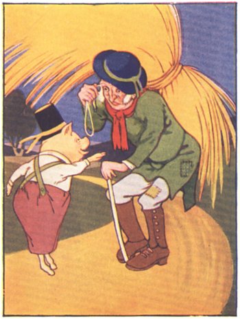 The first that went off met a man with a bundle of straw, and said to him, "Please, man, give me that straw to build me a house;" which the man did, and the little pig built a house with it.