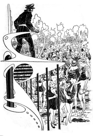 The men named got slowly to their feet, fingering their light hunting pistols self-consciously. Benson continued, "You may appreciate these precautions when I tell you that Sam Rogers and I just encountered two remarkably humanoid animals on the beach less than half a mile from here."