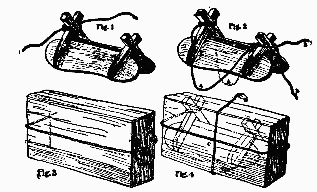 Jones was occupied with a small mule which he claimed was "bad." He hitched said mule to a tree, then proceeded to elevate one hind leg by means of a rope thrown over a limb. Why he did not simply blindfold[16] the animal no one could tell. We looked forward with some joy to the throwing of the pack-hitches.