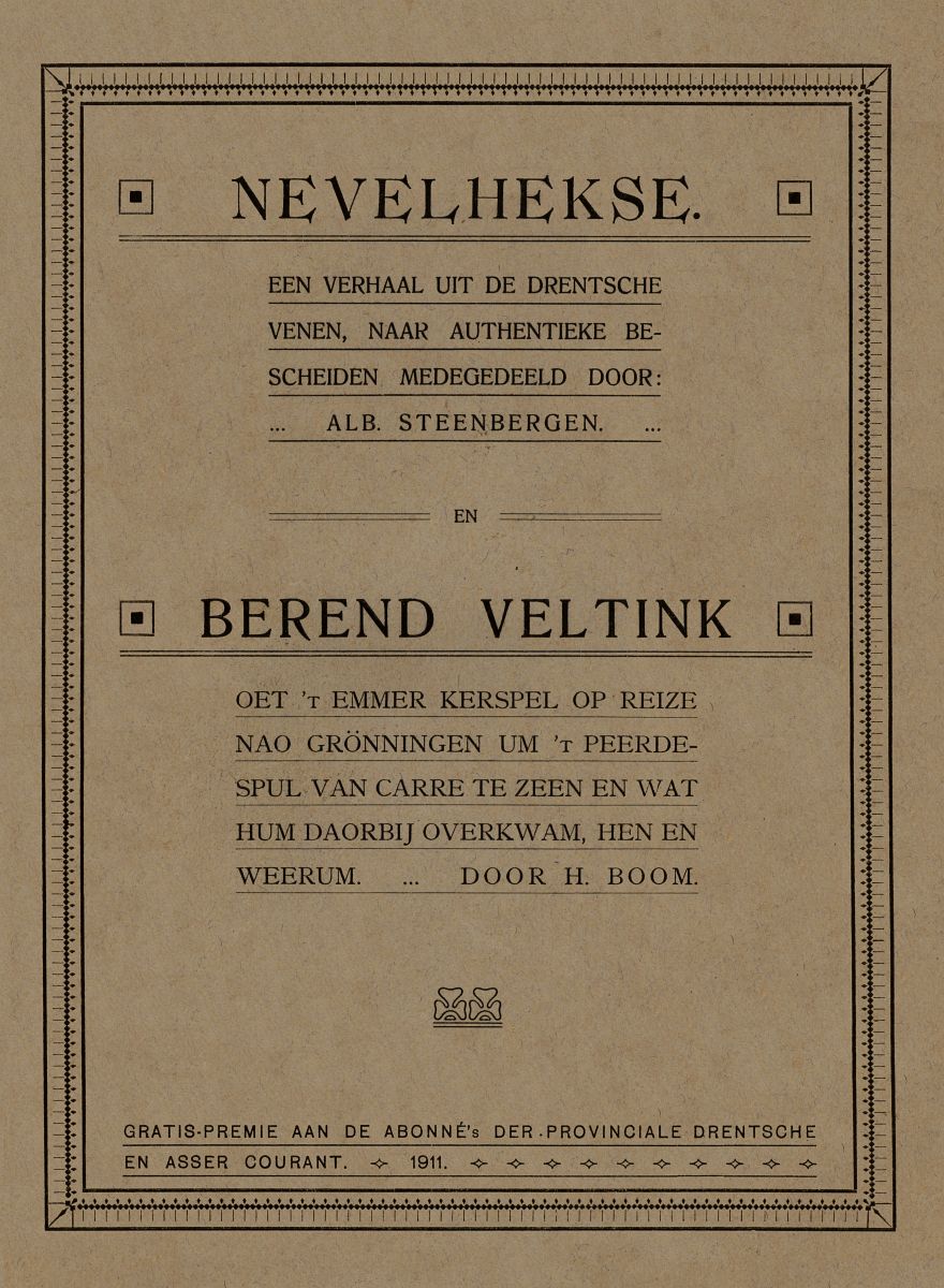Um vief uur, trok Jaaije mij an 't linkeroor en ruep: „nao 't peerdespul Berend!” en een kwartiertien laoter was Berend Veltink in 't Zöndagsche pak.