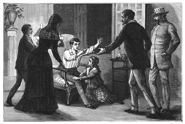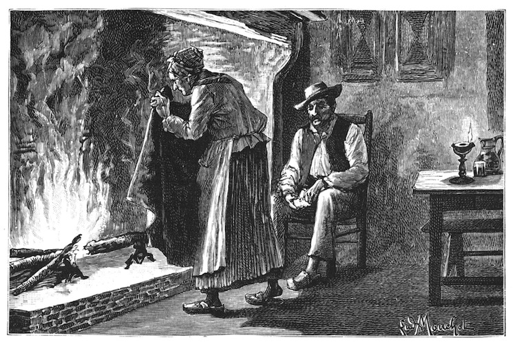 The man advanced, and, feeling in a bag suspended at his side, he said,—