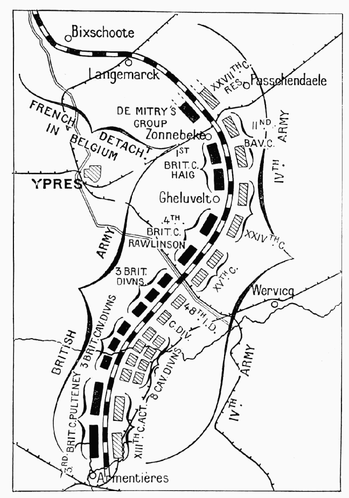 At the beginning of the battle all this part of the front was held by the British army, as follows: from Zonnebeke to Zandvoorde, the 1st Corps (Haig) and 4th Corps (Rawlinson); from Zandvoorde to Messines, the Calvary Corps (Allenby), two infantry divisions, and the Lahore Division, which had just landed at Marseilles; lastly, from Messines to Armentières, the 3rd Corps (Pulteney).