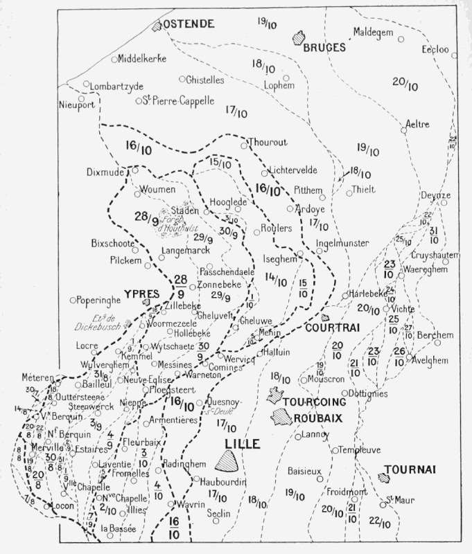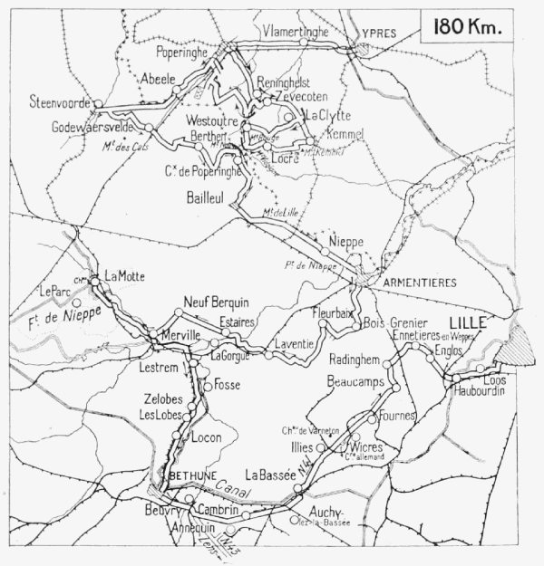 This remarkable "Race to the Sea"—a widely extended movement splendidly carried out by General Foch, and in which the Allied forces in their march towards the north constantly outstripped the enemy—might have been used as the starting-point for a grand Allied offensive against the German right, but the exhaustion of the Belgian army, after the terrible trials which it had just gone through in its retreat on the Yser—following on the fall of Antwerp—and the delays in the transport of the British troops from the Aisne front to the north, prevented the development of this offensive.