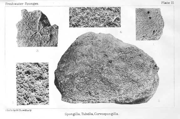 Photographs of dried specimens of Spongilla, Tubella, AND Corvospongilla.