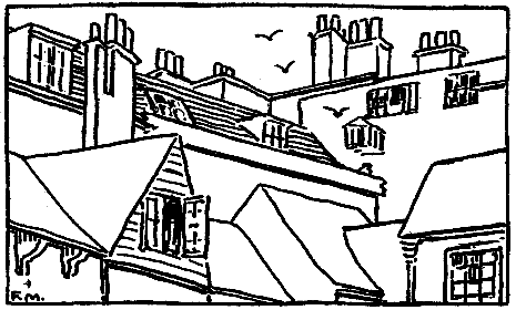 But we are crowded close, wall to wall. I see my neighbor cooking across the street. Each morning she jolts her dust-mop out of the window. I see shadows on a curtain as a family sits before the fire. A novelist is down below. By the frenzy of his fingers on the typewriter it must be a tale of great excitement. He never pauses or looks at the ceiling for a plot. At night he reads his pages to his patient wife, when they together have cleared away the dishes. In another window a girl lies abed each morning. Exactly at 7.45, after a few minutes of sleepy stretching, I see her slim legs come from the coverlet. Once she caught my eye. She stuck out her tongue. Your stockings, my dear, hang across the radiator.