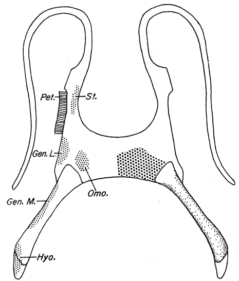 | Median part of upper lip bare; rest of mouth bordered by one row of papillae; inner margin of upper beak forming continuous arch with lateral processes; dark brown markings on tail | |