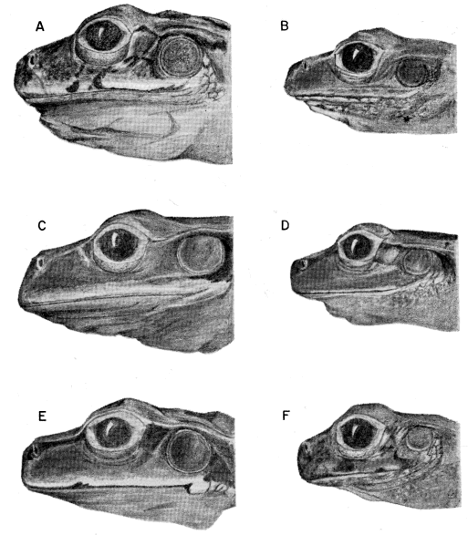 | 1. | Larger frogs ([M] to 76 mm., [F] to 90 mm.) having broad flat heads and a dark brown or black postorbital mark encompassing tympanum |