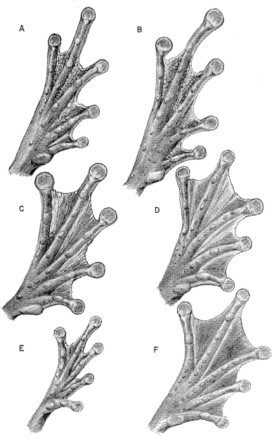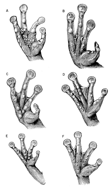| Fingers about one-half webbed; diameter of tympanum about one-half that of eye; dorsum variously marked with spots or blotches | |