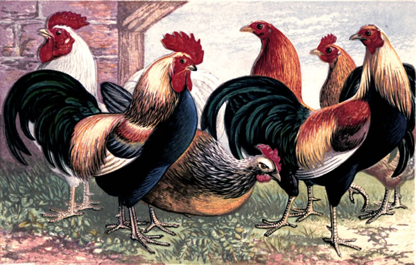 "That the Bankiva jungle-fowl of Java, or its larger continental variety, if it be not a distinct species (and of which Sir W. Jardine states that he has seen several specimens), is one of the sources of our domestic breeds, cannot, we think, be for a moment doubted. It would be difficult to discover any difference between a clean-limbed, black-breasted red Bantam-cock, and a cock Bankiva jungle-fowl. Indeed, the very term Bantam goes far to prove their specific identity. Bantam is a town or city at the bottom of a bay on the northern coast of Java; it was first visited by the Portuguese in 1511, at which time a great trade was carried on by the town with Arabia, Hindostan, and China, chiefly in pepper. Subsequently it fell into the hands of the Dutch, and was at one time the great rendezvous for European shipping. It is now a place of comparative insignificance. From this it would seem that the jungle-fowls domesticated and sold to the Europeans at Bantam continued to be designated by the name of the place where they were obtained, and in process of time the name was appropriated to all our dwarfish breeds."