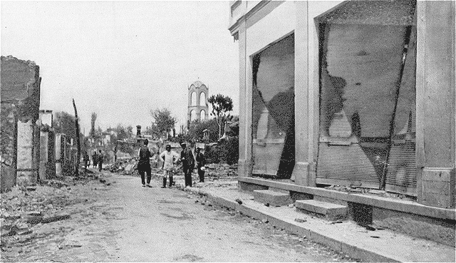 On entend des détonations; des cartouches, des obus éclatent; aussi des mines; un vrai nid à dynamite. Le feu en aura raison Toutes les maisons brûlent; de grosses gerbes d'étincelles. Voici une maison qui vient de prendre feu. Par les fenêtres, de grandes langues rouges sortent et lèchent le mur. Puis, un grand fracas: le toit croule et nous voyons l'immense brasier faire face au ciel.