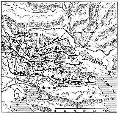 Allons vers l'état-major de la 2e division. (J'ai oublié de dire que les 1.500 blessés sont ceux de la 2e division seulement.) Nous voici sur le champ de bataille. Des morts, des morts par centaines, tombés de ce matin et déjà défigurés par la grande chaleur. Ah! les Grecs ont payé cher leur victoire. Les Bulgares s'étaient fortifiés sur les hauteurs depuis la prise de Salonique,--tant ils avaient peu l'intention d'attaquer les Grecs! Des tranchées faites avec tout l'art militaire, où des centaines de Grecs sont venus trouver la mort. La plupart des cadavres sont au fond, percés de coups de baïonnette, affreusement déchirés.