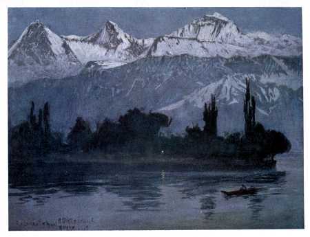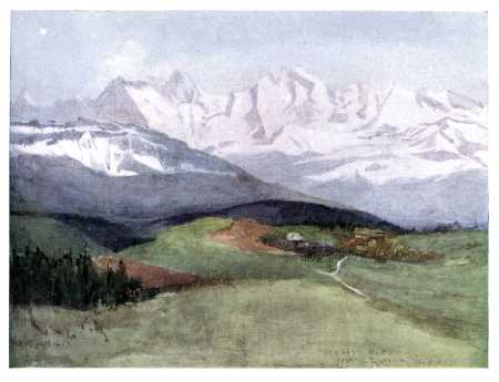 At last the day came when the sea was crossed and the long railway journey (how long it seemed!) was accomplished. We approached Olten. The Oberland ought to have appeared, but only rain fell. We reached Bern, and drove up to the little country village of Zimmerwald, where my friends were staying; still there was no distant view—nothing but wooded and green hills around, that reminded me of other views, and revealed no such startling novelty as I was awaiting. One day passed and then another. On the third morning the sun rose in a sky perfectly clear. When I looked from my window across the green country, and over the deep-lying lake of Thun, I saw them—"suddenly—behold—beyond!" Jungfrau, Mönch, Eiger, and the rest, not yet individuals for me, not for a long time yet, but all together, a great white wall, utterly unlike any dream of [4] them that had visited me before, a new revelation, unimaginable, indescribable, there they stood, and from that moment I also entered into life.