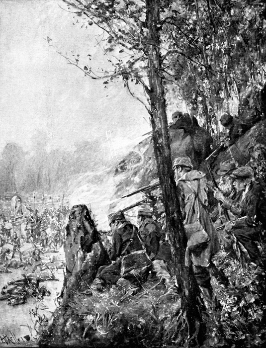 The dry crash of the volley ended the matter; all the men against the wall collapsed. Presently one of them, the boy who had been crying, moved his arm in the grass. A rifle spoke instantly, and he moved no more.