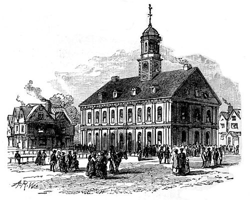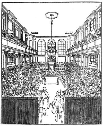 [15] Things seemed to be getting into somewhat the condition contemplated in the satirical print of “The Man in the Moon,” which appeared as frontispiece to a tract published in London in 1776, entitled “A Plea of the Colonies on the Charges brought against them by Lord Mansfield and others.” The Man in the Moon is George III. looking through a telescope held by his Tory chief justice, whose sleeve shows the Scotch plaid of Clan Murray. He looks upon a reversed and topsy-turvy world, in which New York (whose true latitude is nearly the same as that of Naples) appears farther north than London, and America is east of Europe. The American coast is covered with vast armies, and the whole British fleet is on its way thither, leaving England exposed to the attack of a French host gathered at Dunkirk. Meanwhile the Gallic cock crows lustily, and the sketchy outline of Great Britain indicates that the artist supposes the island “may be so far wasted before the year 1800, that people will hardly know where the nation resided that was once so formidable.” See Tracts 985, Harvard University Library.