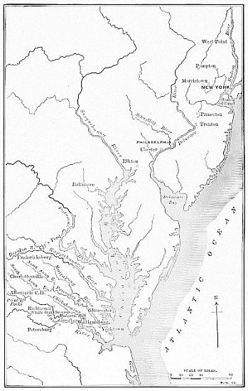 [41] It is interesting to contrast with the movements of Cornwallis those of an eminent general in more recent times. Early in 1865 General Sherman was at Columbia, on the Congaree river, about thirty miles southwest from Camden, and the difficult task before him was, without any secure base of operations nearer than Savannah, to push the Confederate forces northward to a decisive defeat in North Carolina. With this end in view, Sherman feigned to be aiming at Charlotte, while in reality he moved the bulk of his army northeasterly across the Pedee and Cape Fear rivers to Goldsborough, near the coast, where he established a new and secure base of operations. The battle of Bentonville, fought just before Sherman reached this base, was the unsuccessful attempt of his skilful antagonist, Joseph Johnston, to prevent his reaching it. Sherman’s march northwestward from his new base was well secured, and Johnston’s surrender near Hillsborough was a natural sequel. But—as my friend, Mr. John Codman Ropes, in a letter to me once pointed out—"had Sherman pursued his march from Columbia to Charlotte, and thence until he had met and fought Johnston, the result of the inevitable losses of the battle, leaving the question of victory aside, might have been such as to compel a retreat to Savannah.”
