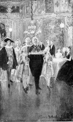 Betty asked if it was far to the gallery; and, finding that it was quite near the part of the house where they were, she went out with Pagot along the corridors with their long rows of doors, and into the musicians' gallery, where they found themselves at a delightful point of view. Danesly Castle had been built at different times; the banquet-hall itself was very old and stately, with a high, carved roof. There were beautiful old hangings and banners where the walls and roof met, and lower down were spread great tapestries. There was a huge fire blazing in the deep fireplace at the end, and screens before it; the long table twinkled with candle-light, and the gay company sat about it. Betty looked first for papa, and saw him sitting beside Lady Dimdale, who was a great friend of his; then she looked for Lady Mary, who was at the head between the two gentlemen of whom Pagot had spoken. She was still dressed in black lace, but with many diamonds sparkling at her throat, and she looked as sweet and quiet and self-possessed as if there were no great entertainment at all. The men-servants in their handsome livery moved quickly to and fro, as if they were actors in a play. The people at the table were talking and laughing, and the whole scene was so pleasant, so gay and friendly, that Betty wished, for almost the first time, that she were grown up and dining late, to hear all the delightful talk. She and Pagot were like swallows high under the eaves of the great room. Papa looked really boyish, so many of the men were older than he. There were twenty at table; and Pagot said, as Betty counted them, that many others were expected the next day. You could imagine the great festivals of an older time as you looked down from the gallery. In the gallery itself there were quaint little heavy wooden stools for the musicians: the harpers and fiddlers and pipers who had played for so many generations of gay dancers, for whom the same lights had flickered, and over whose heads the old hangings had waved. You felt as if you were looking down at the past. Betty and Pagot closed the narrow door of the gallery softly behind them, and our friend went back to her own bedroom, where there was a nice fire, and nearly fell asleep before it, while Pagot was getting the last things unpacked and ready for the night.
