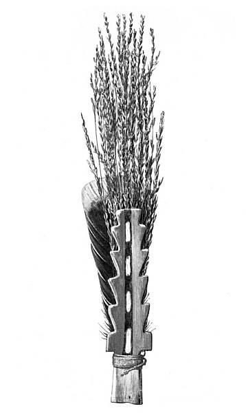 Each of these prayer-sticks was double the length of the[Pg 266] middle finger, and was painted black with green pigment at the blunt end. On one of the two sticks which compose this prayer offering, there was cut a facet which was painted green with black dots representing eyes and mouth. The stick without the facet was called the male, and upon it a ferrule was incised.