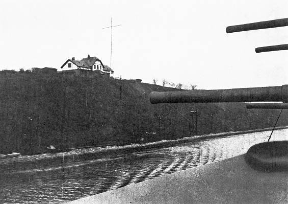 [28] The fog was still thick at daybreak of the following morning, but by ten o'clock the visibility had improved sufficiently to appear to make it worth while to get under weigh. Heading easterly at twelve knots, we shortly came to a buoy-marked channel which, according to our directions, promised to lead in to the anchorage off Wilhelmshaven we desired to reach. The Regensburg, which had evidently gone in ahead, was not sighted again, but two powerful armed patrol boats came out to keep us company. It was soon possible to see for several miles, the low line of the Frisian coast coming into sight to port and starboard.