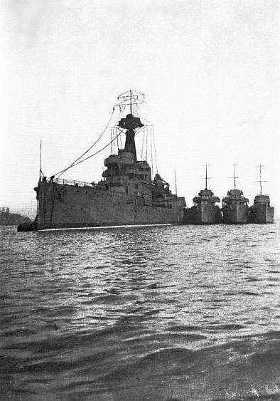 Now, panorama resumed. It was the day of the surrender, and the Cardiff, with her high-flown kite balloon in tow, was leading the line of German battle-cruisers out of the eastern mist. I was watching from the bridge of the Erin, and an officer beside me, recognizing the Seydlitz, flying the rear-admiral's flag, in the lead, with the Moltke and Derfflinger next in line, told how, from the light cruiser in which he had chased them at Dogger Bank, he had seen at least two of the three, leaving the Blücher to her fate, dashing for the shelter of their minefields with flames swirling about their mastheads. Another spoke casually of how, in the Tiger at Jutland, he had been for a wild minute or two, while his ship was rounding a "windy corner" as Beatty turned north to meet the British Battle Fleet, under the concentrated fire of all the battle-cruisers—with the exception of the Hindenburg, but with the Lützow added—now steaming past us. We remarked the "flattery of imitation" in the resemblance of the Hindenburg with her long run of[14] forecastle and "flare" bows, to the Repulse and Renown, and of the symmetrical, two-funnelled Bayern as she appeared between the Kaisers and the Königs in the German battleship line to the British Queen Elizabeth class laid down before the war. The Queen Elizabeth herself, falling out of line to take the salute of the ships of the fleet she had led to victory as they passed, brought that reel of panorama to an end.