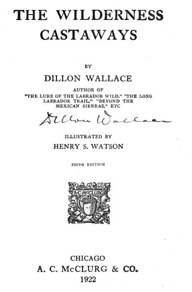 The Project Gutenberg EBook of The Wilderness Castaways, by Dillon Wallace This eBook is for the use of anyone anywhere at no cost and with almost no restrictions whatsoever. You may copy it, give it away or re-use it under the terms of the Project Gutenberg License included with this eBook or online at www.gutenberg.org Title: The Wilderness Castaways Author: Dillon Wallace Illustrator: Henry S. Watson Release Date: March 21, 2013 [EBook #42382] Language: English Character set encoding: UTF-8 *** START OF THIS PROJECT GUTENBERG EBOOK THE WILDERNESS CASTAWAYS *** Produced by Stephen Hutcheson, Rod Crawford, Dave Morgan, Matthew Wheaton and the Online Distributed Proofreading Team at http://www.pgdp.net