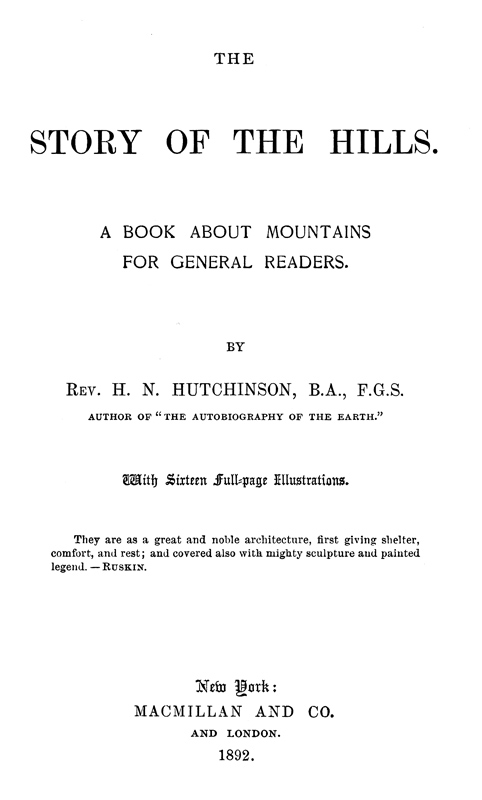 The author desires to acknowledge his obligations to the writings of Sir A. Geikie; Professor Bonney, Professor Green, and Professor Shaler, of Harvard University; the volumes of the "Alpine Journal;" "The Earth," by Reclus; the "Encyclopædia Britannica." Canon Isaac Taylor's "Words and Places," have also been made use of; and if in every case the reference is not given, the writer hopes the omission will be pardoned. A few passages from Mr. Ruskin's "Modern Painters" have been quoted, in the hope that others may be led to read that wonderful book, and to learn more about mountains and clouds, and many other things, at the feet of one of the greatest teachers of the century.