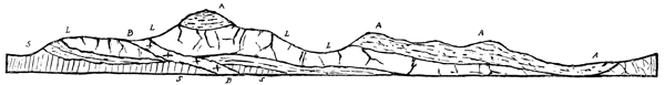 We have seen how the substance of the mountains was slowly manufactured by means of such quiet and gentle operations as may be witnessed at the present day; how the rivers of old 335 brought down their burdens as they do now, and flung them into the sea; how the sea spread them out very slowly and compacted them into level layers, to form, in process of time, the hard rocky framework of the plateaux, hills, and mountains of the world; how vast marine accumulations were also slowly manufactured through the agency of countless generations of humble organisms, subtracting carbonate of lime from sea water to form the limestones of future ages; how by slow earth-movements these marine deposits were reared up into dry land; how they have frequently been penetrated by molten rocky matter from below, which occasionally forced its way up to the surface and gave rise to various volcanic eruptions, by means of which the sedimentary rocks were often considerably baked and hardened, and new fissures filled up with valuable metallic ores and precious stones; how lava-flows and great deposits of volcanic ash were mingled with these sedimentary rocks.