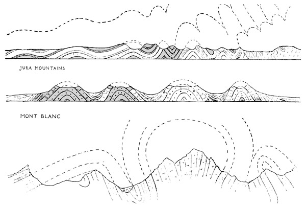 This we endeavoured to illustrate in chapter ix. by means of a simple experiment with a sheet of paper; and it was shown how folds similar to those of which Mont Blanc is composed could be imitated by simply pressing the sides of a sheet of paper inwards with one's two hands as it lies on a table. Such lateral pressure, it is thought by many, must be caused by the shrinking of the lower and hotter parts of the earth's crust as they cool, leaving the outer crust unsupported, so that it gradually settles down onto a smaller surface below, and 338 in so doing must inevitably be wrinkled and throw itself into a series of folds (see chapter vi., page 204).