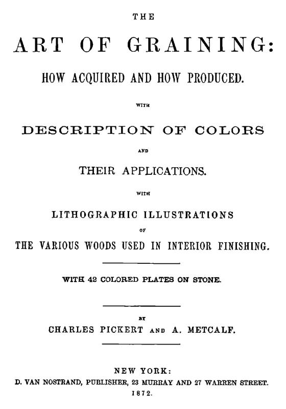 The Project Gutenberg EBook of The Art of Graining: How Acquired and how Produced., by Charles Pickert and A. Metcalf This eBook is for the use of anyone anywhere at no cost and with almost no restrictions whatsoever. You may copy it, give it away or re-use it under the terms of the Project Gutenberg License included with this eBook or online at www.gutenberg.org Title: The Art of Graining: How Acquired and how Produced. With the description of colors and their applications. Author: Charles Pickert A. Metcalf Release Date: March 8, 2014 [EBook #45079] Language: English Character set encoding: ISO-8859-1 *** START OF THIS PROJECT GUTENBERG EBOOK THE ART OF GRAINING *** Produced by Chris Curnow, Mary Akers and the Online Distributed Proofreading Team at http://www.pgdp.net (This file was produced from images generously made available by The Internet Archive)