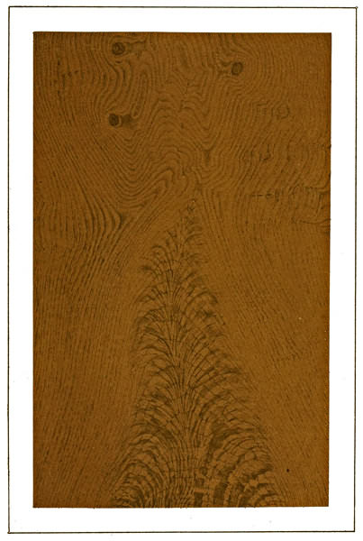 For wiping out oak (as in samples shown), see description of process in our following chapter on black walnut, using the same tools, etc. (rubber combs, English or American steel combs in oak, not in walnut). Where flaking is done it is combed first with a coarse, then a fine steel comb, but where heart or growth-pieces occur, no comb should be used until wiped out, then comb with a fine comb very lightly in the same direction the grains may run.