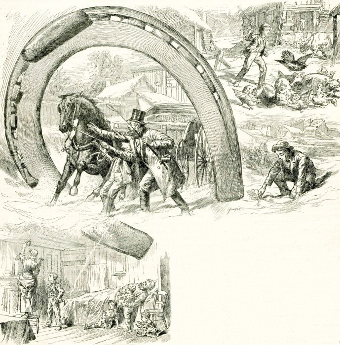 When Tommy reached home that night he found his father propped up in bed making a supper off of new-laid eggs. His father said it was driving the hens round on the sunny side of the farm, but Tommy stuck to it that it was the horseshoe. After that it was like the house that Jack built. The hens began to lay; Pop began to eat and get well, and read the Psalms instead of Job; the cow had a pretty calf, and began to give lots of milk; the winter began to break; and the doctor began telling the Tucker family of a noble way of squatting out West that beat their way all to nothing, and how there was lots of land out there considerably better than the sunken lots, and how, instead of watching one lazy horse, that wouldn't run away without there was a providence in it, Tommy might have a whole drove of chargers like Mr. Crœsus', and Mr. Tucker might raise millions of bushels of golden grain, and he shouldn't wonder if Tommy would be President yet, and his three little brothers feeding away at a public crib that never gives out.
