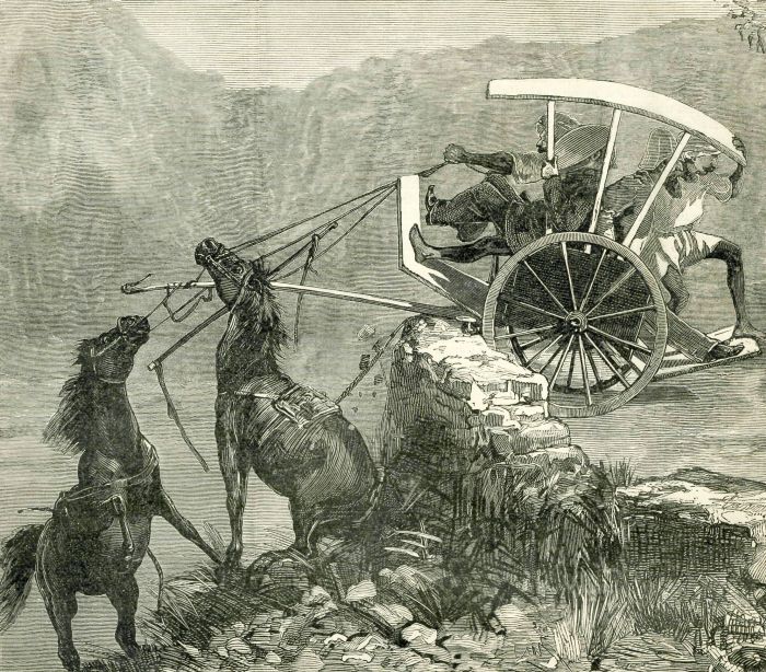 Although there are about ten thousand miles of railroad in Hindostan, the country is so vast, and in many portions of it so mountainous, that much of the travelling is yet performed by old-fashioned methods. We see one of them in the accompanying sketch, and perhaps our young readers will think that there is sometimes as much danger attaching to the "old slow coach" as to the swift-rushing iron horse. The conveyance in our sketch is what is known as a "hill cart," a curious kind of vehicle, with a seat before and behind covered with a leathern hood, hung very low, and possessing two strong wheels. It is drawn by two ponies, whose general pace is a hand-gallop.