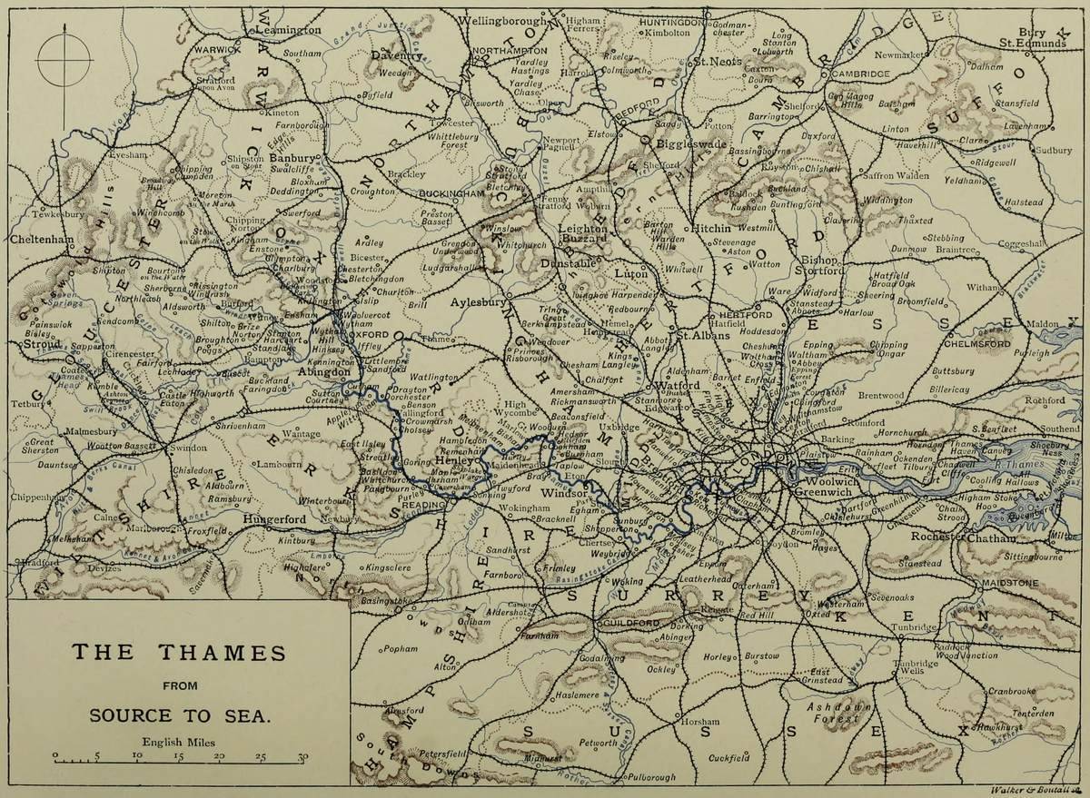On the very threshold of our task we are confronted, indeed, with two sometime-disputed points which it will be necessary to clear away, or come to terms with, if we would proceed upon our voyage of some two hundred miles from source to Nore with a clear conscience. They relate, first, to the name of the river; and second, to the precise spot in the Cotswold country where it starts upon its wanderings. Neither of these controversial subjects shall, however, detain us long from an intimate acquaintance with the “mighty king of all the British rivers, superior to most in beauty, and to all in importance,” setting forth on its career in humble smallness, gathering tranquil volume as it flows in succession through the fertile counties of Gloucestershire, Wiltshire, Berkshire, Oxfordshire, Buckinghamshire, Surrey, Middlesex, Kent, and Essex, and finally delivering its full tribute to the Northern Ocean. What rare historical memories it evokes, what varieties of landscape it touches and creates, let the following lines describe:—