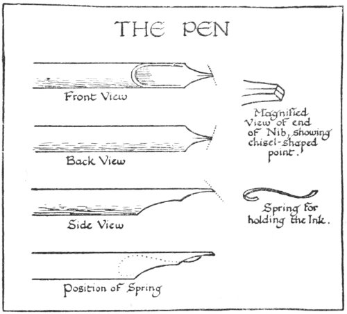 For the construction of well-finished lettering it is essential that a mastery of the tool and materials employed should be acquired. It is when the pen becomes almost a part of the writer, so that he is able to concentrate all his energy on the writing, giving scarcely any attention to the pen itself, that he may claim to be proficient in the use of the pen.