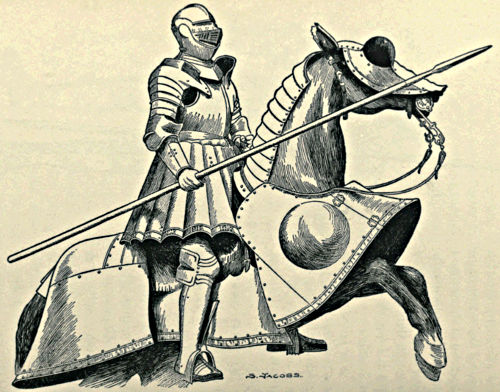 The average Englishman is probably more unacquainted with arms and armour than any other technical subject. Beyond a general idea that the Crusaders fought in mail, and the Wars of the Roses were waged by warriors clad in plate, his knowledge does not extend, and he consequently witnesses many startling incongruities upon the stage of a theatre, or the arena of a pageant, with the most profound indifference. He will perceive Richard III. in a camail and[Pg xii] Ivanhoe in a salade with the utmost complacency. The pity of it is that those who are responsible for the historical inaccuracies should be so ignorant, for no effort ought to be spared in endeavouring to educate the nation, and especially the youth of it, in the fundamental principles of rigid historical truthfulness. In our theatres recently we have witnessed Bolingbroke in a fifteenth century tabard, a waist-belt, and round-toed sabbatons, with the Duke of Norfolk in an almost equally grotesque parody of the Camail and Jupon Period; Pistol with a basket-hilted rapier; Henry V. in a camail, late fifteenth century gauntlets, twentieth century boots, and vambraces covering parts of his coudières. Upon the arena knights of Richard II.’s period have appeared in full plate armour of 1470; at Queen Eleanor’s funeral without ailettes; while bear’s-paw sabbatons have figured conspicuously in many scenes previous to 1480. These are elementary details which even a cursory knowledge of military equipment could avoid, but in the illustrations of historical scenes in books and magazines equal ignorance prevails, and a knight in pure mail and a surcoat, making love to a maiden in a reticulated head-dress seated under a two-centred Tudor archway, is only an example of the incongruities which almost every day insult the intelligence and offend the eyesight of the educated reader. Unfortunately many illustrators go to the works of Sir Walter Scott for details of mediæval military equipment, and are thereby led hopelessly astray.
