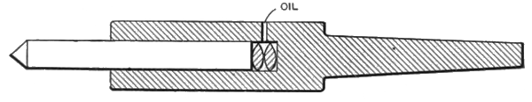 Another important part of the spinning lathe is the tail-center. This center is sometimes the ordinary dead center that is in general machine shop use, but nearly all spinners use the revolving center, shown in Fig. 2. The revolving center is ¾ inch diameter (without taper) and about six inches long, and is fitted into the socket in which it runs; this socket is, in turn, fitted to the taper hole in the tailstock. At the bottom of the hole in the socket are two steel buttons, hardened and ground convex on their faces. These buttons act as ball bearings and reduce friction to a minimum.