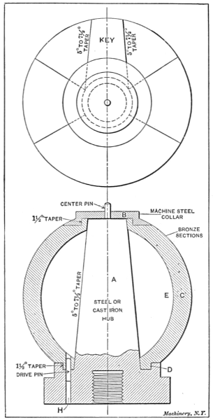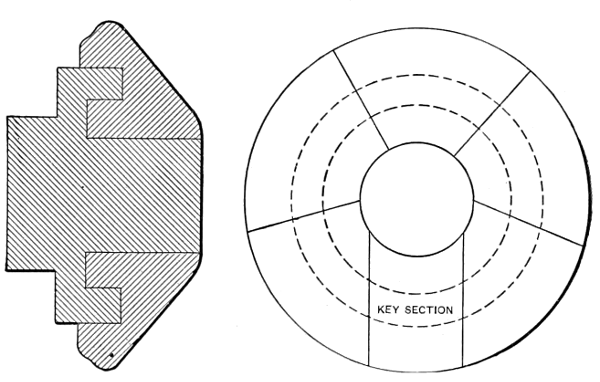 A sectional or “split” chuck, as it is sometimes called, is, as the name implies, a spinning chuck or form which may be taken apart in sections after the shell has been spun over it. As before stated, this class of spinning chuck is only used when the finished shell could not be removed from an ordinary form after spinning. After a shell has been spun over a sectional chuck, the shell and the sections of the chuck are together pulled lengthwise from the core of the chuck. Then, starting with the key section, it is an easy matter to remove each section from the inside of the shell. As the sections are removed, they are replaced upon the core, slipped under the retaining flange and the chuck is ready for spinning a new shell. The whole operation of removing and replacing the sections of a chuck takes less time than it does to tell it, and, as the sections are of different sizes, it is easy to replace them in the proper order. Like other forms, sectional chucks are made of wood or metal, according to the requirements of the job. The core and retaining ring are first made from one piece and then the sections are turned in a continuous ring and split with a fine saw. In some cases it is necessary to add a small piece to the last section to make up for the stock lost in splitting the sections.