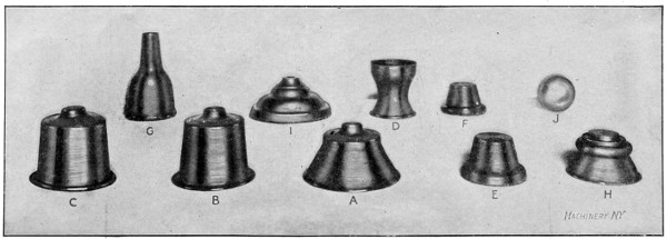 Referring to the illustration Fig. 7, A, B and C represent the three most important stages of spinning a shell like that shown at C. Annealing is necessary between steps A and B. D is a shell spun upon a form of the plug variety, and E and F are two views of a shell spun after the method shown in Fig. 4, F being the completed shell. G illustrates a very difficult shell to spin, on account of the small follower that must be used; the length of the small diameter also adds to the difficulty. H shows a shell that must be spun upon a sectional chuck, while I is a plain easy job of ornamental spinning. The ball shown at J was spun from one piece of aluminum and it is more of a curiosity than a specimen of practical spinning. It was first spun over a form that would leave one-half of the ball complete and the stock for the other half straight out like a short tube. Next a wooden split chuck was made, hollowed out to receive the finished end of the ball and the open end was gradually spun down and in until the ball was complete with but a ¹/₁₆-inch hole at the end. This hole was plugged and the hollow ball was done.