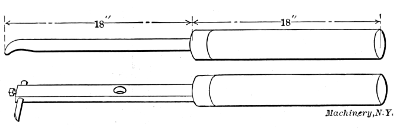 Hand tools, in great variety, form the principal asset of the spinner’s kit. Spinning tools are made of tool steel forged to the required shapes, and are hardened and polished on the working end. The round steel from which they are made varies from ½ inch to 1½ inch in diameter, according to the class of work upon which they are to be used. The length of a spinning tool is about 2 feet, and it is fitted into a wooden handle 2 inches diameter and 18 inches long, making the total length of the handled tool about 3 feet, as shown in Fig. 8. As the spinner holds this handle under the right armpit, he secures a great leverage upon the work and is better able to supply the physical power required to bring the metal to the desired shape.