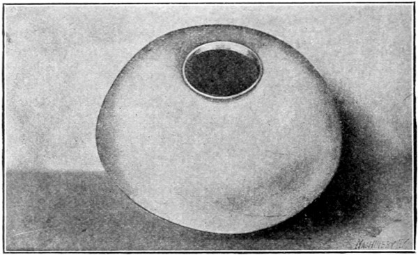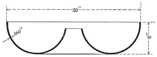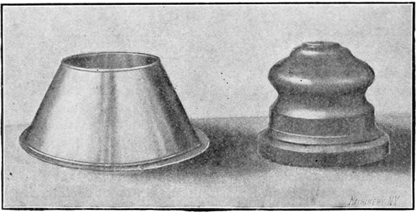 In Fig. 18 is shown an example of aluminum spinning. The article illustrated is a cuspidor having a top 7¾ inches in diameter, a neck with a 4-inch flare, a diameter at the top of 9½ inches, and a height of 6½ inches. This shell was spun without annealing, which shows the extreme ductility of aluminum. The copper shell shown in Fig. 19, has a maximum diameter of 7 inches, and a depth of 8 inches; it was spun with four annealings. A German silver reflector, which is 10 inches in diameter at the largest end and 5 inches deep, is shown in Fig. 20. The spinning of such a reflector, when made from this material, is quite difficult. An open hearth cold-rolled steel shell with[21] a maximum diameter of 3 inches and a depth of 4 inches is shown in Fig. 21. This shell was spun without annealing, which shows that the grade of steel used is well adapted for this work.