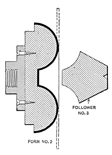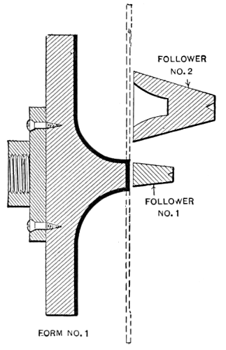 In starting to spin a difficult shell it sometimes happens that the[9] necessarily small follower will not hold the blank. To prevent this slipping, the face of the follower is covered with emery cloth. Often, however, on rough work, the spinner will not stop to face the follower, but will make a large shallow dent at the center of the blank; the extra pressure required to force the metal against the form will usually overcome the slipping tendency.