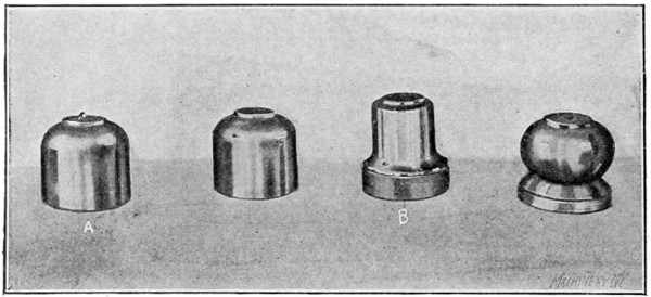 There are but two practical ways of forming pieces of sheet metal into hollow circular articles: by dies and by spinning. By far the cheapest and best method of producing quantities of this class of work is by the use of dies, but there are many cases where it is impractical or impossible to follow this course. Dies are expensive and there is constant danger of breakage, whereas spinning forms are easily and cheaply made and are almost never damaged by use beyond a reasonable amount of wear. Thus it will be seen that when the production is small, it does not pay to make costly dies. Again, the styles or designs of many articles that are spun are constantly being changed; if made by dies each change would necessitate a new die, while in spinning merely a new wooden form is required—and sometimes the old form can be altered, costing practically nothing. Still other advantages of spinning are that in working soft steel, a much cheaper grade may be spun than can be drawn with dies; beads may be rolled at the edges of shells at little expense; experimental pieces may be made quickly, and, added to these features comes the fact that very difficult work that cannot possibly be made with dies can be spun with comparative ease. It must not be construed from the above that spinning is to be preferred to die work in all or even in the majority of cases, because, on the contrary, die work is a more economical method of manufacture, and should always be used when possible on production work. The cases already cited are merely given to point out some of the instances in which, for economical reasons, spinning is to be preferred to die work.