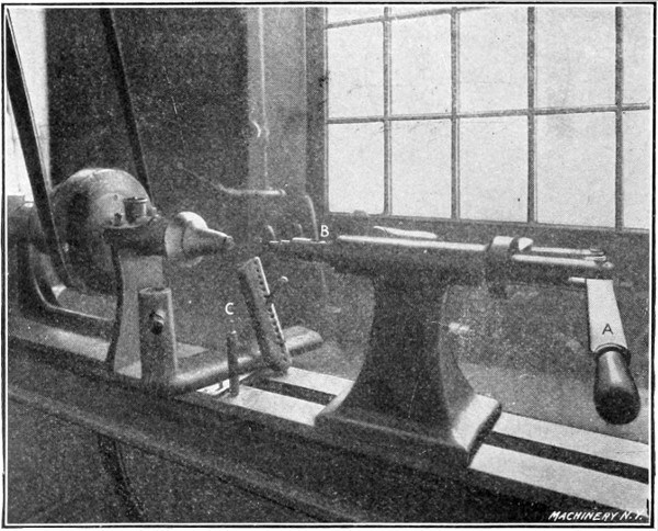 The principal tool used in the operation of spinning is the spinning lathe, shown in Fig. 1. While in many respects this machine is similar to any other lathe, it is built without back-gears, carriage or lead-screw, is very rigid in construction, and, on the whole, very much resembles a speed lathe. Like other lathes, the spinning lathe is fitted with a cone pulley (preferably of wood, because of its lightness and gripping qualities), allowing the use of four or five different speeds. Speed is an important factor in spinning. Arbitrary rules for spinning speeds cannot be given, as the thicker the stock the slower must be the speed; thus while ¹/₃₂-inch iron can be readily spun at 600 revolutions, ¹/₁₆-inch iron would necessitate reducing the speed to 400 revolutions per minute. Zinc spins best at from 1,000 to 1,400 revolutions; copper works well at 800 to 1,000; brass and aluminum require practically the same speed, from 800 to 1,200; while the comparatively slow speed of 300 to 600 revolutions is effective on iron and soft steel. Brittania and silver spin best at speeds from 800 to 1,000 revolutions.