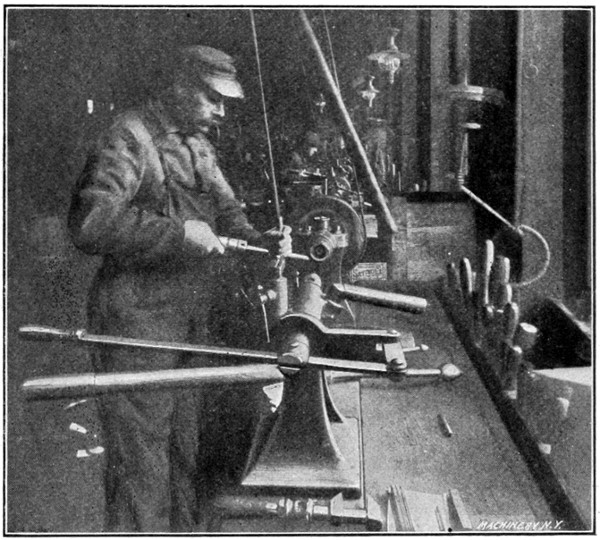The amateur can imitate the Russian work, but never the work of the skilled spinner. There are several grades of spinners, most of them never attaining the skill of the model-maker or the facility for handling the different metals. A man that has had several years of experience spinning brass or copper would not be able to spin britannia or white metal without stretching it to a very uneven thickness. As brass or copper is harder than the other metals mentioned, they resist the tool more and require more pressure in forming, and if the operator used the same pressure on the softer metals, he would stretch or distort them, so that they would be perhaps one-quarter of the original thickness at angles and corners where the strain in spinning would be greatest, which would ruin the articles. The best test for skill in ordinary spinning, is to take a long difficult shape, after being finished, and saw it in two lengthwise, and if the variation in thickness is less than 25 per cent of the original gage, it is good practice. Some spinners can keep within 10 per cent of the gage on ordinary work, but they are scarce.
