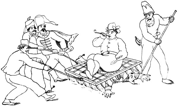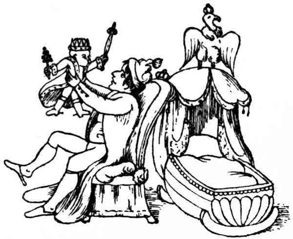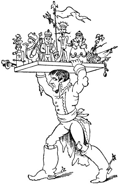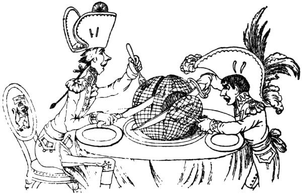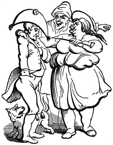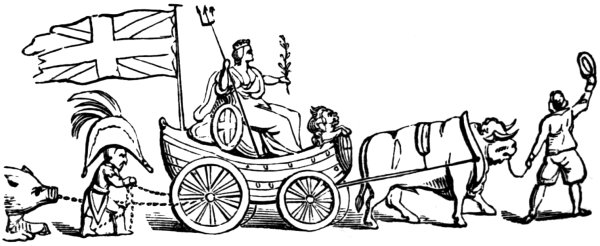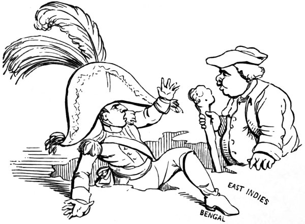 Another print, by West (December 1803), shows ‘Mr. and Mrs. Bull giving Buonaparte a Christmas Treat!’ The latter is bound to a post in sight of, but beyond reach of, the national fare of this festival. John Bull says, holding up a piece of beef, in derision, ‘Yes, yes—the Beef is very good, so is the pudding too—but the deuce a morsel do you get of either, Master Boney.’ Mrs. Bull too, who is drinking from a frothing tankard, says: ‘Your health Master Boney, wishing you a merry Christmas,’ but offers him none.