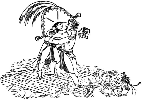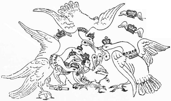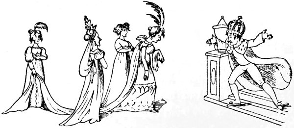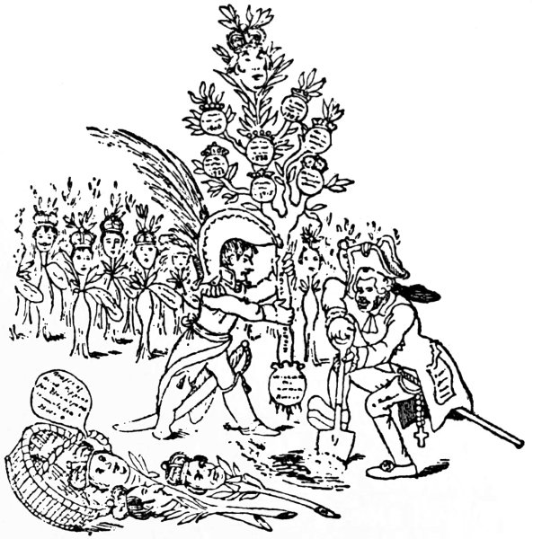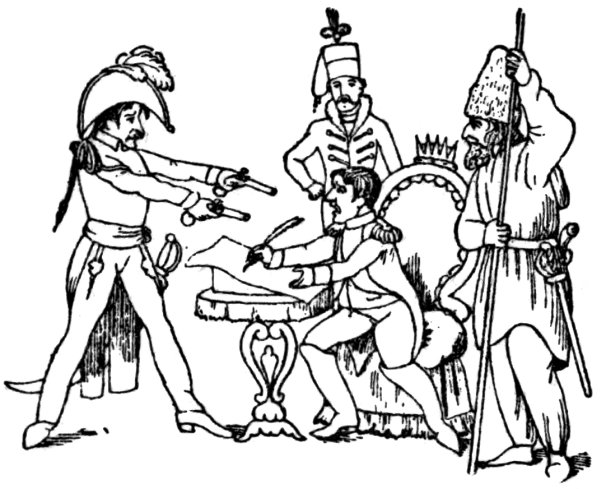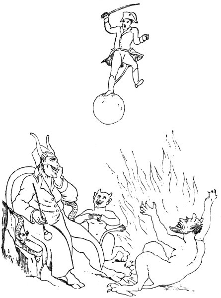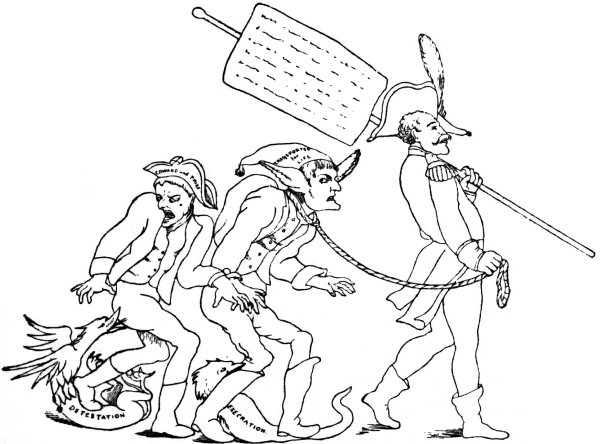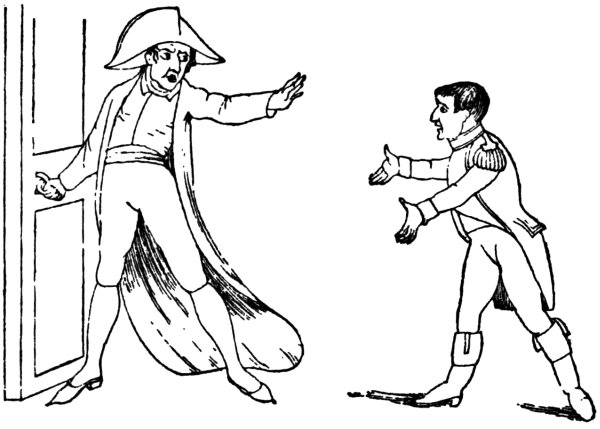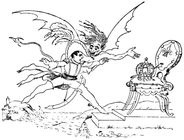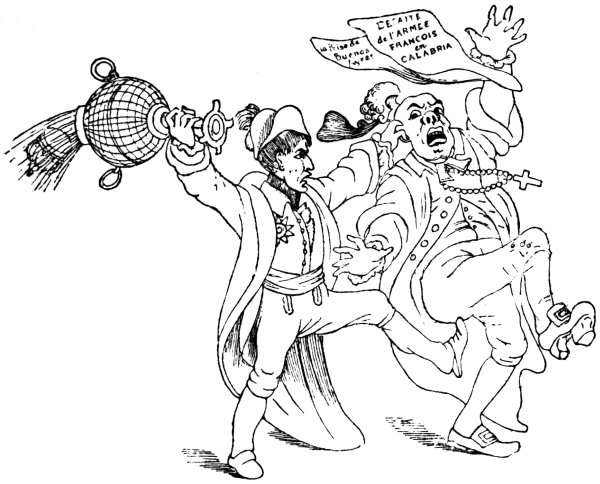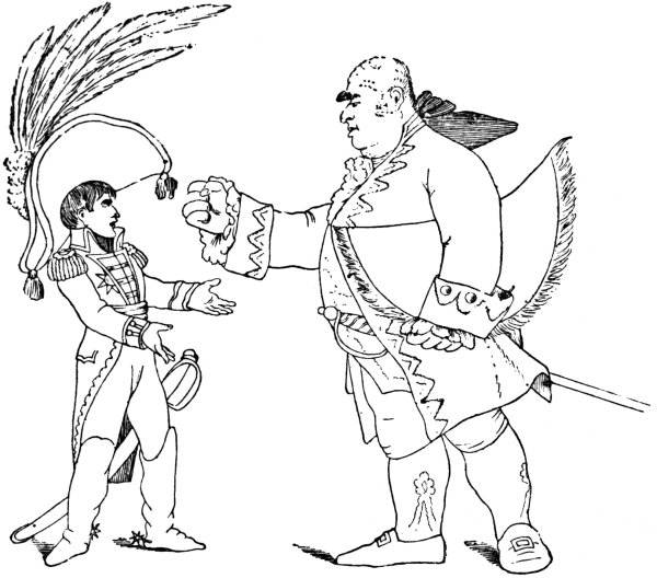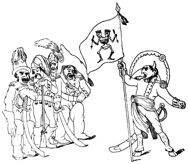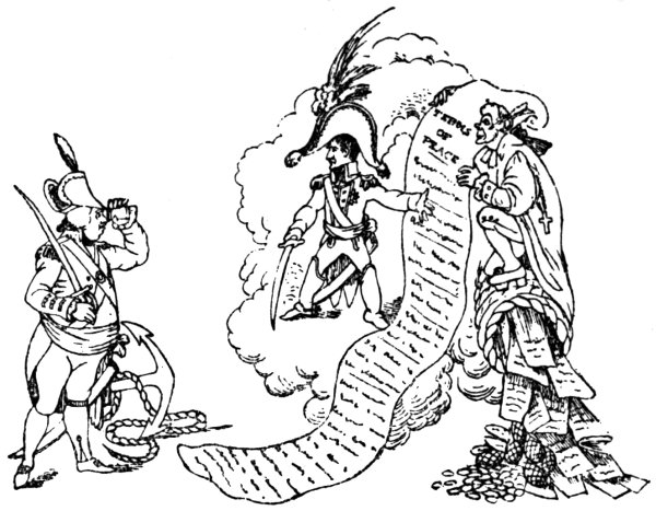 Ansell (June 2, 1804) gives us ‘The Cold Blooded Murderer, or the Assassination of the Duc d’Enghien,’ in which the duke is represented as being bound to a tree, a soldier on either side holding a torch, whilst Napoleon is running his sword into his heart. D’Enghien bravely cries out, ‘Assassin! your Banditti need not cover my Eyes, I fear not Death, tho’ perhaps a guiltless countenance may appall your bloodthirsty soul.’ Napoleon, whilst stabbing his victim, says: 9‘Now de whole World shall know de courage of de first grand Consul, dat I can kill my enemies in de Dark, as well as de light, by Night as well as by Day,—dare—and dare I had him—hark, vat noise was dat? ah! ’tis only de Wind—dare again, and dare—Now I shall certainly be made Emperor of de Gulls.’1 Devils are rejoicing over the deed, and are bearing a crown. They say: ‘This glorious deed does well deserve a Crown, thus let us feed his wild ambition, untill some bold avenging hand shall make him all our own.’