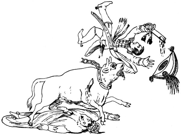 ‘Selling the Skin before the Bear is caught, or cutting up the Bull before he is killed,’ is by I. Cruikshank (December 21, 1803), and represents a Bull reposing calmly on the English shore, whilst on the opposite or French coast is Bonaparte, Talleyrand, and several Generals. Bonaparte, pointing to the Bull, says: ‘I shall take the Middle part, because it contains the Heart and Vitals—Talley, you may take the head, because you have been accustomed to take the Bull by the horns.’ Britannia stands, fully armed, behind the Bull, by an ‘alarm post,’ on which hangs a bell, ‘British Valor,’ which she is preparing to ring: ‘When these Mounseers have settled their plan, I will just rouse the Bull, and then see who will be cut up first.’