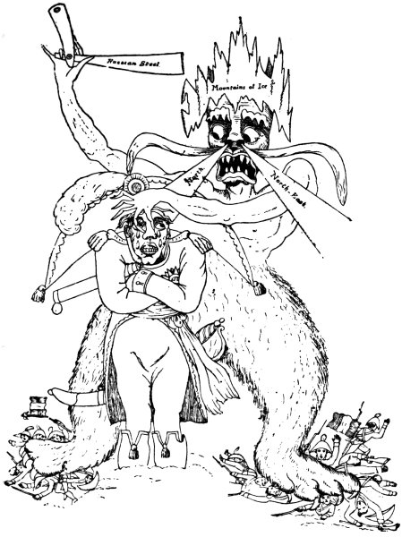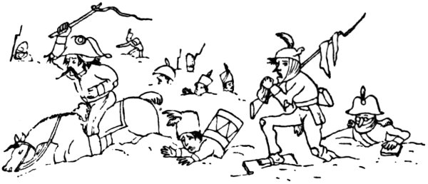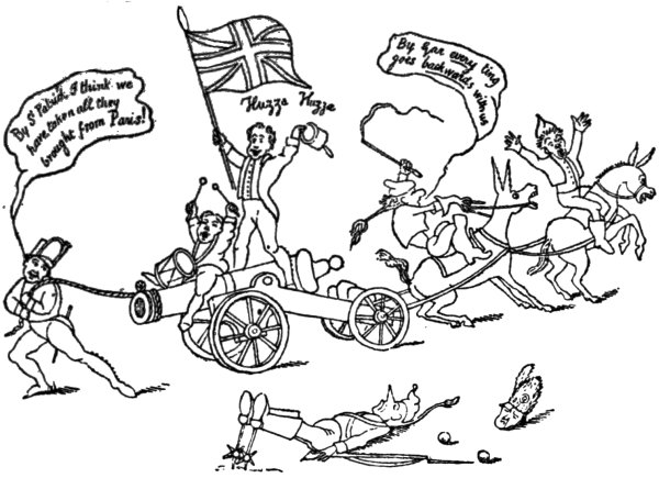 The Volunteer movement was well shown in a print by A. M., November 1803: ‘Boney attacking the English Hives, or the Corsican caught at last in the Island.’ There are many hives, the chief of which has a royal crown on its top, and is labelled ‘Royal London Hive. Threadneedle Street Honey’—which Napoleon is attacking, sword in hand. George the Third, as Bee Master, stands behind the hives, and says, ‘What! what! you plundering little Corsican Villain, have you come to rob my industrious Bees of their Honey? I won’t trust to your oath. Sting, Sting the Viper to the heart my good Bees, let Buz, Buz be the Word in the Island.’ The bees duly obey their master’s request, and come in clouds over Napoleon, who has to succumb, and pray, kneeling, 2‘Curse those Bees they sting like Scorpions. I did not think this Nation of Shopkeepers could sting so sharp. Pray good Master of the Bees, do call them off, and I will swear by all the three creeds which I profess, Mahometan, Infidel, and Christian, that I will never disturb your Bees again.’